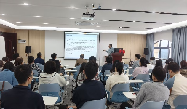 2025年12月22日,應廣西應用數(shù)學中心(南寧師范大學)以及數(shù)學與統(tǒng)計學院的邀請,湘潭大學李繼春教授為學院師生作了題為“超材料與石墨烯中麥克斯韋方程的有限元分析及數(shù)值模擬”的學術(shù)報告。報告由數(shù)統(tǒng)學院黃在堂院長主持,全體學術(shù)型研究生參與了此次學術(shù)活動。