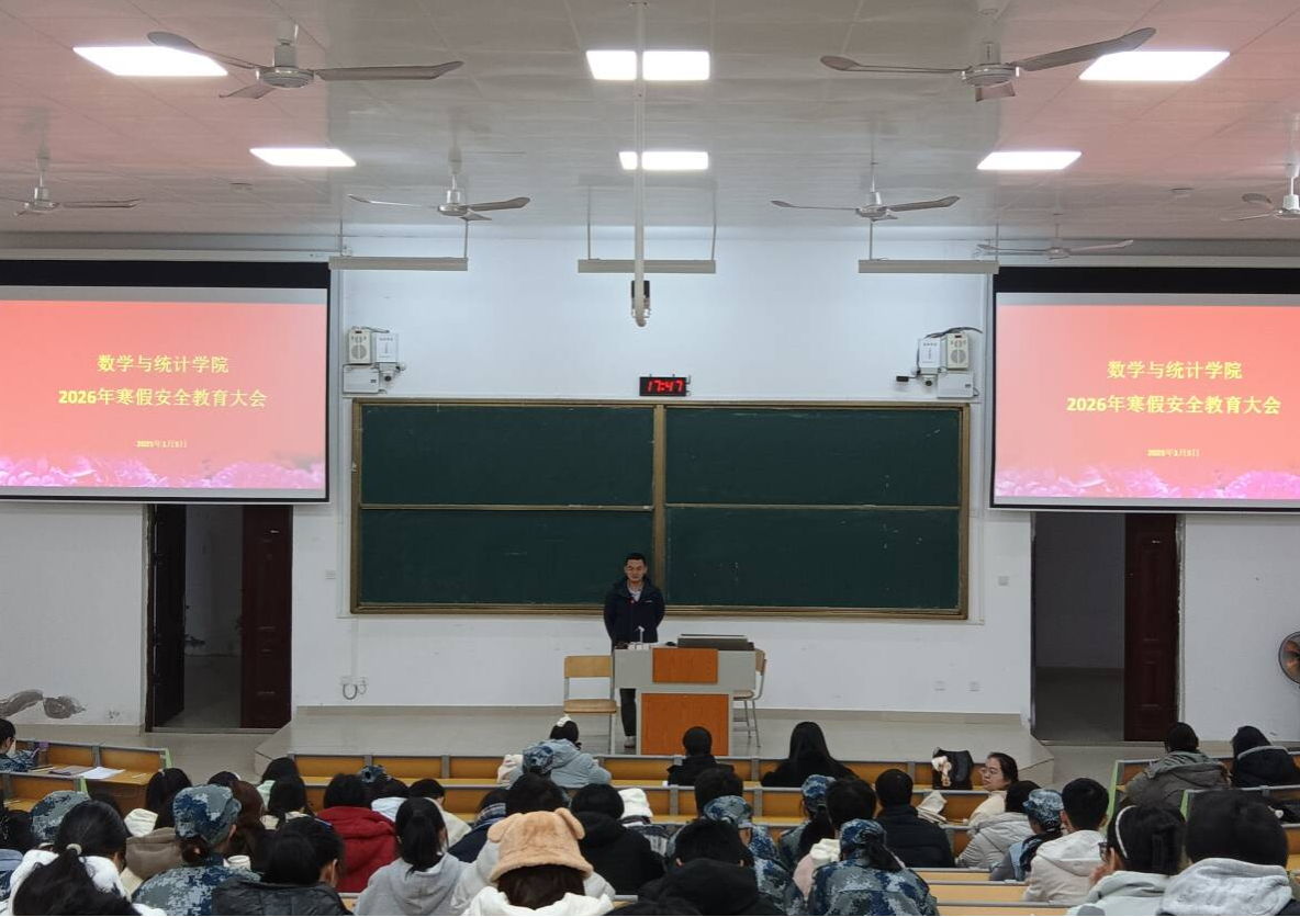 為進(jìn)一步強(qiáng)化學(xué)生寒假安全防范意識(shí),切實(shí)保障全院學(xué)生度過(guò)平安祥和的假期,1月5日,數(shù)學(xué)與統(tǒng)計(jì)學(xué)院在實(shí)驗(yàn)2-B108教室召開(kāi)2026年寒假安全教育大會(huì)。學(xué)院黨委副書(shū)記王衛(wèi)彬,團(tuán)委書(shū)記梁卡霖,輔導(dǎo)員盧若楷、滕容梅出席會(huì)議,各班班長(zhǎng)及生活委員參加會(huì)議。
