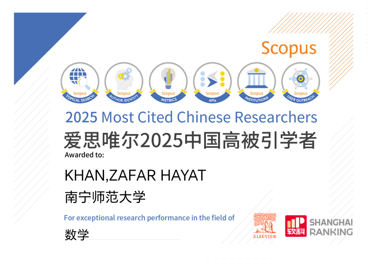 近日,愛思唯爾(Elsevier)重磅發(fā)布2025“中國高被引學(xué)者”(Highly Cited Chinese Researchers)榜單,我校數(shù)學(xué)與統(tǒng)計學(xué)院可汗教授連續(xù)三年(2023-2025年)成功入選。